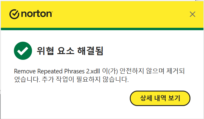 바로 위의 스샷처럼 자동으로 관련 파일을 위협 요소로 판단하여 삭제해버렸다는 알림이 떴음.