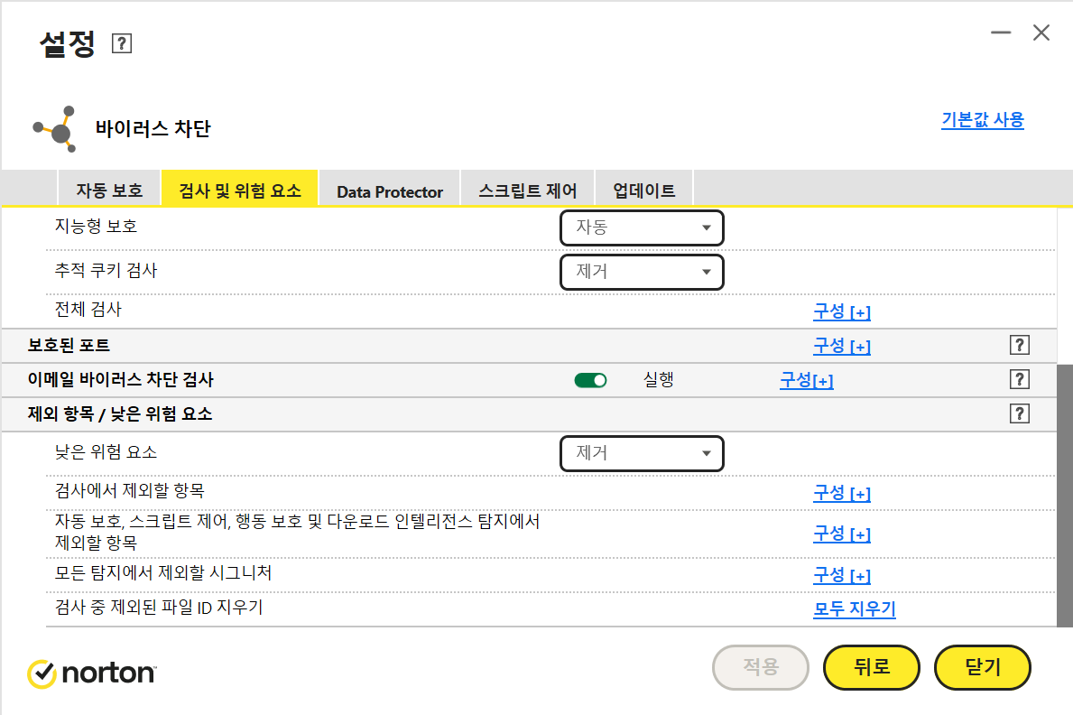 Norton 자동 보호, 스크립트 제어, 행동 보호 및 다운로드 인텔리전스 검사에서 파일 및 폴더 제외
